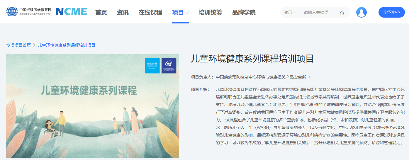 由中国疾病预防控制中心环境所与联合国儿童基金会驻华办事处联合出品、世界卫生组织驻华代表处提供支持的儿童环境健康系列课程,已于中国继续医学教育网完成学分认证升级。现面向全体医疗卫生工作者免费开放学习,完成考核即可申领继续教育学分 3 分,为广大医务人员专业能力提升与继续教育学分积累提供双重助力。