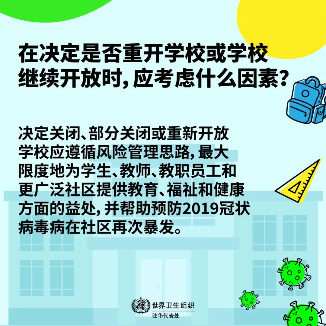 尽管目前的证据表明,儿童患严重疾病的风险总体上低于成人,我们还可以采取特别的预防措施来尽量减少儿童感染的风险。与此同时,应当考虑重返学校的益处。学校重新开放,有什么因素需要考虑呢?